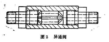 在氣缸下部進(jìn)出口處安裝一只降噪異通閥,此閥進(jìn)氣時由于阻尼作用,能夠控制啟動氣流量,排氣時則自動轉(zhuǎn)換成正常通路。同時,活塞下部氣缸間的空間容積盡可能變 小。在這二個條件同時具備情況下,當(dāng)楔式閘板受活塞和閥桿推力開動》活塞快速移動一小距離時,其下部空間壓力隨即變小,甚至產(chǎn)生瞬時負(fù)壓。從而可減小或避免氣流沖九達(dá)到降噪目的。見圖1。為了降低開閥噪聲我所自制了一只降噪異通閥(見圖2),用于氣動閘閥壽命試驗(yàn)氣路上,試驗(yàn)中對閥門啟動有較好的減噪作用。由于當(dāng)時受試驗(yàn)用閥門的氣動構(gòu)件設(shè)計制造情況所限,其實(shí)際空間容積 VG較大,上述二個條件中小的條件不滿足,因而降噪程度還未能達(dá)到要求。筆者認(rèn)為,如果進(jìn)一步降低VG,則降噪效果將會提高。