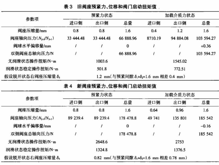 根據有限元分析結合N-ö曲線數據分別計算舊閥座和新閥座的啟動扭矩結果見表3和表4,從中可以看出,無論新舊閥座,在無潤滑狀態下的操作扭矩均遠大于有潤滑狀態下的操作扭矩值。同時由于新舊閥座內曲面半徑R的變化,直接導致了閥門的操作扭矩發生了明顯的不同,新閥座明顯大于舊閥座。
